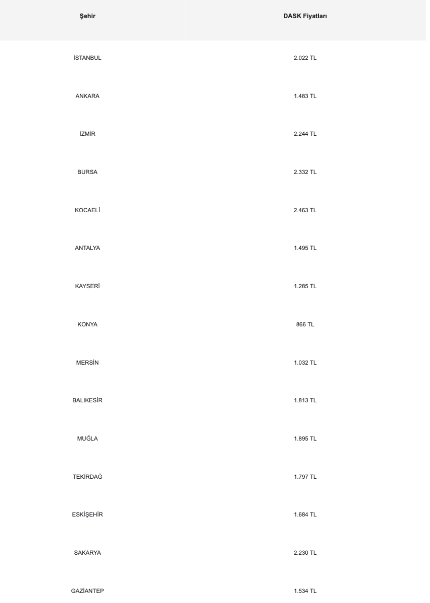 Tablodaki fiyatlar yaklaşık olup yapı türü ve bina yaşı gibi ek faktörler prim tutarını değiştirebilir. Kesin ücret, DASK.gov.tr üzerinden sorgulanmalıdır.